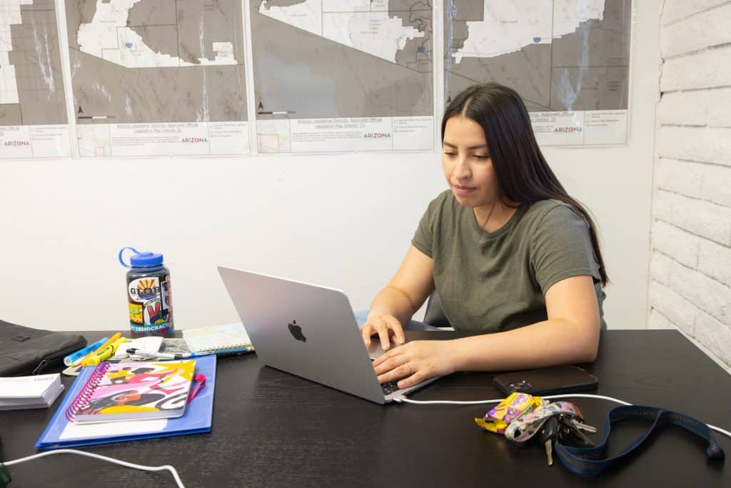 Pero el trabajo no lo realiza Correa solo: detrás de él tiene un grupo de coordinadores y voluntarios entusiasmados y convencidos de que es posible lograr un cambio en las zonas rurales. Una de esas personas es Esmeralda “Esme” Barajas, quien es directora regional de campañas del sur de Arizona para RAZE.