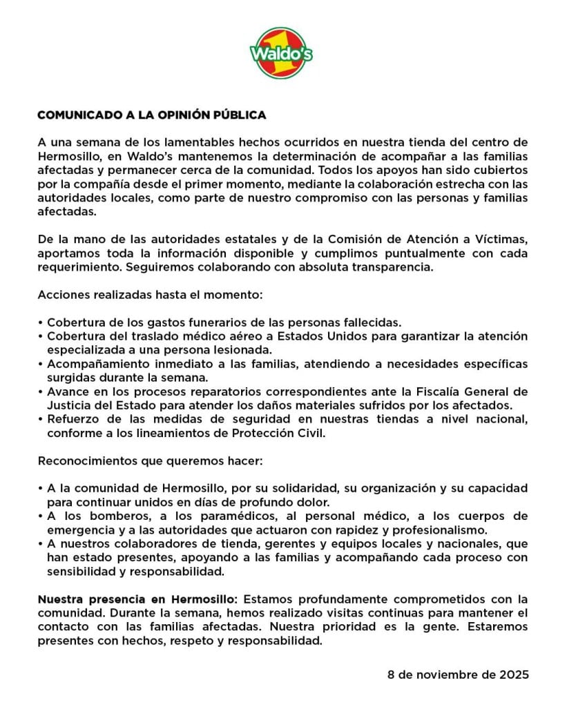 En el mismo documento, Waldo’s agradece a la comunidad de Hermosillo por su solidaridad, y a los cuerpos de emergencia por su rápida y profesional actuación.